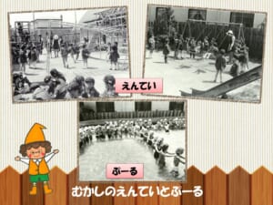 スライドで 今と昔の写真を見ると、「へーつ!!プール?」「すごーい!!ふるーい!」など歓声があがっていました。特にバスのスライドの反響が大きかったです。