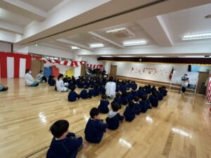 ホールに集まって、園長先生からのお話を聞き、先生から1学期の行事について、写真と共に確認しました。